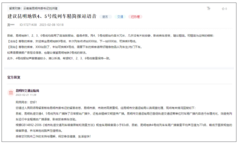 目前,昆明轨道交通4、5号线列车广播除了日常报站广播外,还包含精神文明宣传广播。昆明市交通运输局已督促轨道交通运营单位对车厢广播内容进行合理优化,效避免列车运行中全程播放广播语音,影响旅客乘车体验。