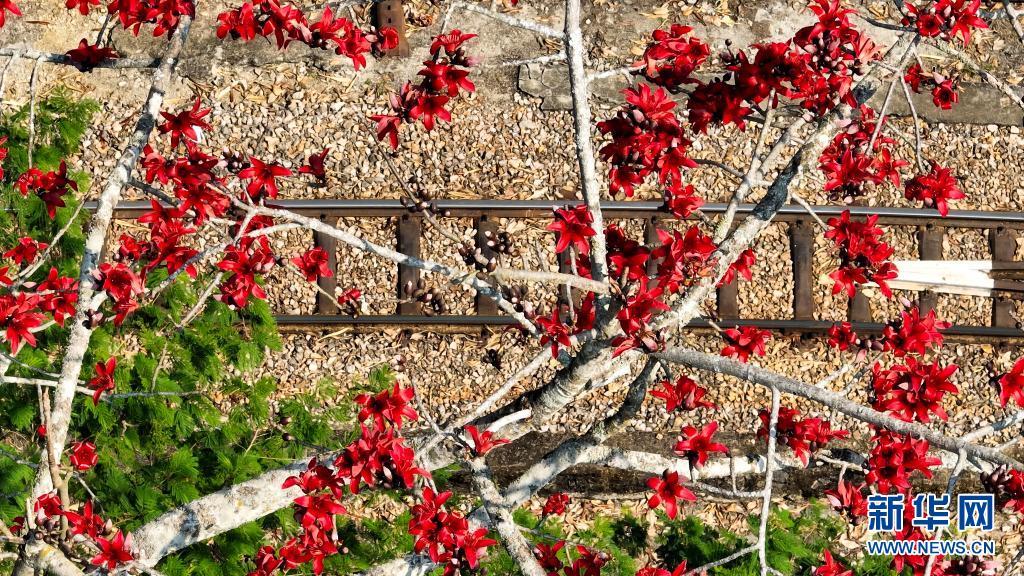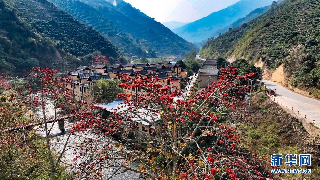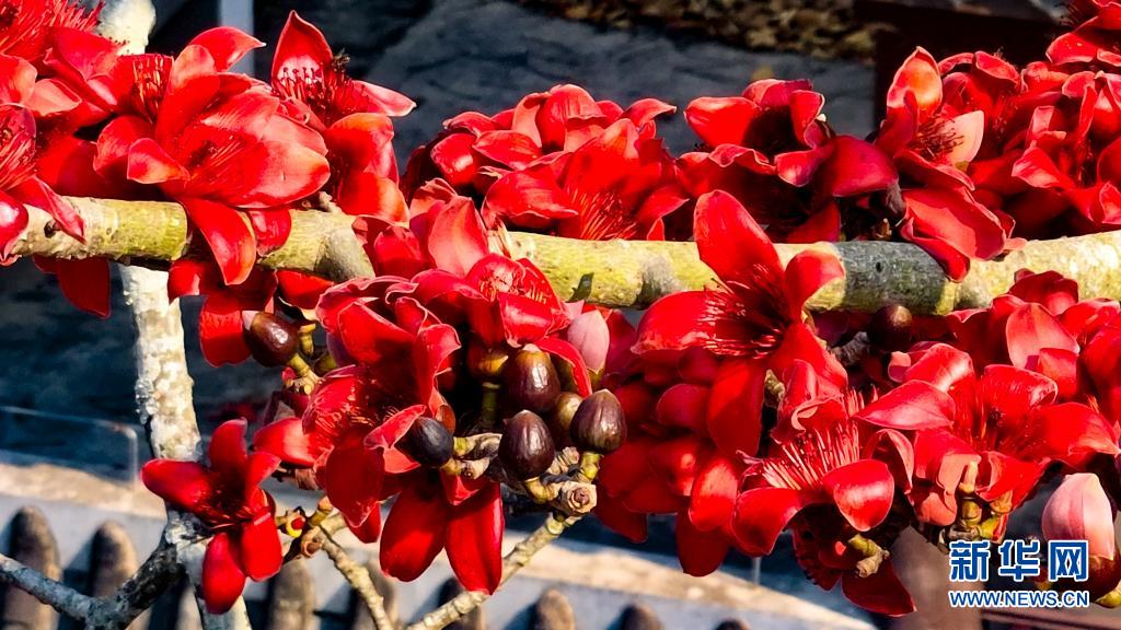近日,云南省红河哈尼族彝族自治州屏边苗族自治县南溪河边,木棉花相继盛开。在独具特色的苗式建筑的映衬下,火红的木棉花与江水形成了一幅“花开红锦绣,水漾碧琉璃”的春光画卷。(李关伟 李超 王国辉 许容珠)