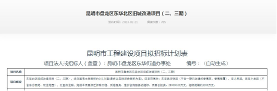昆明信息港讯(昆明日报 全媒体记者李梦瑶)2月21日,云南省公共资源交易信息网发布昆明市盘龙区东华北区旧城改造项目(二、三期)招标计划,涉及国有土地面积94226平方米,约141.34亩。