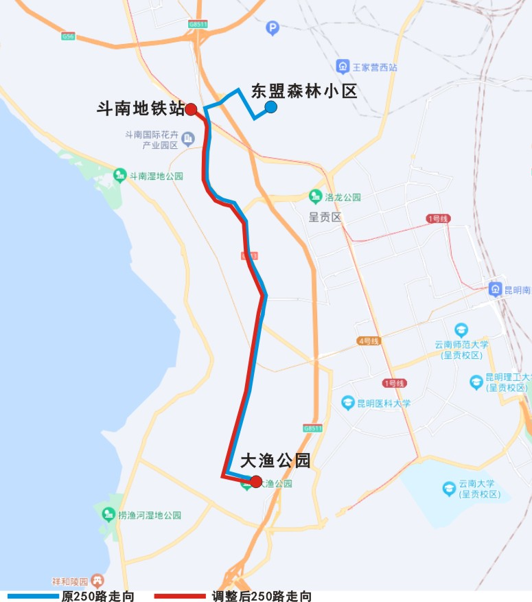 250路调整后,去程由“斗南地铁站”始发,经彩云北路、兴呈路回原线行驶至“大渔公园”终到,回程由“大渔公园”始发,按原线行驶至兴呈路,经兴呈路、彩云北路行驶至“斗南地铁站”终到。新增停靠“斗南地铁站(起始站)、斗南地铁站(彩云北路)(去)、欣城路口(古滇路)(回)、渔舟路口(渔阳路)(回)”等4个公交站点;取消停靠“东盟森林小区(原起始站)、呈荣大道口(回)、东盟森林北区东(去)、小王家营村”等4个公交站点。