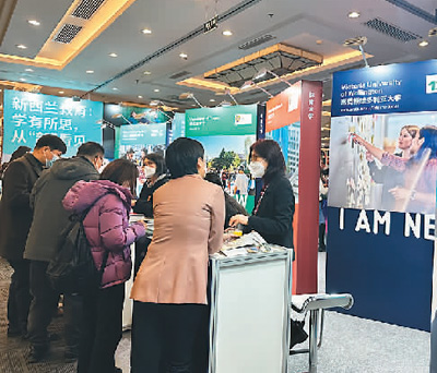 在新西兰展区,8所公立大学云集,吸引了许多家长驻足咨询。
