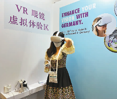 德国展区首设VR虚拟体验逛校园,图为展区相关负责人演示佩戴。