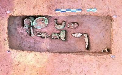 殷墟东围沟内祭祀坑K23上层发掘情况(资料照片)。新华社发