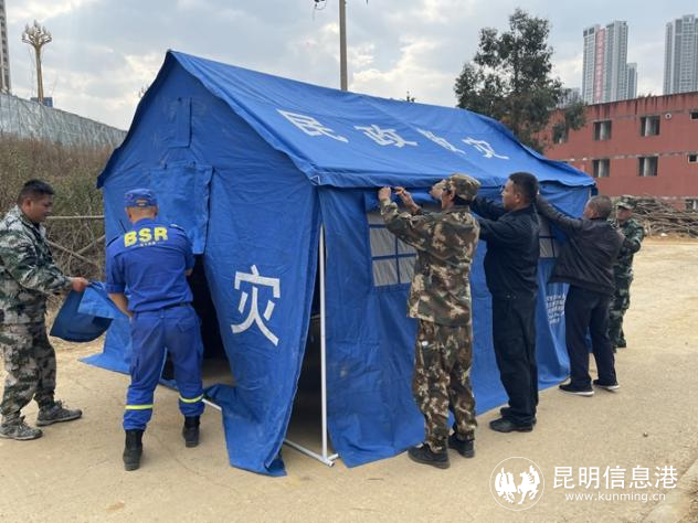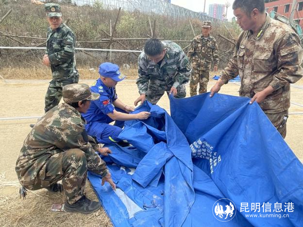 现场,在昆明蓝天救援中心教官的指导下,50余名参训人员被分为三组轮流培训救生艇使用及水面搜救、应急帐篷搭建及拆除、抽水设备使用及维护保养。