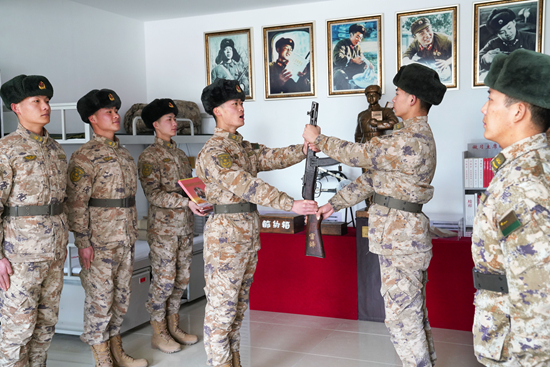 第79集团军某旅“雷锋班”班长牟振华将“雷锋枪”交接给新入班战士蒋佳恒。张永进/摄