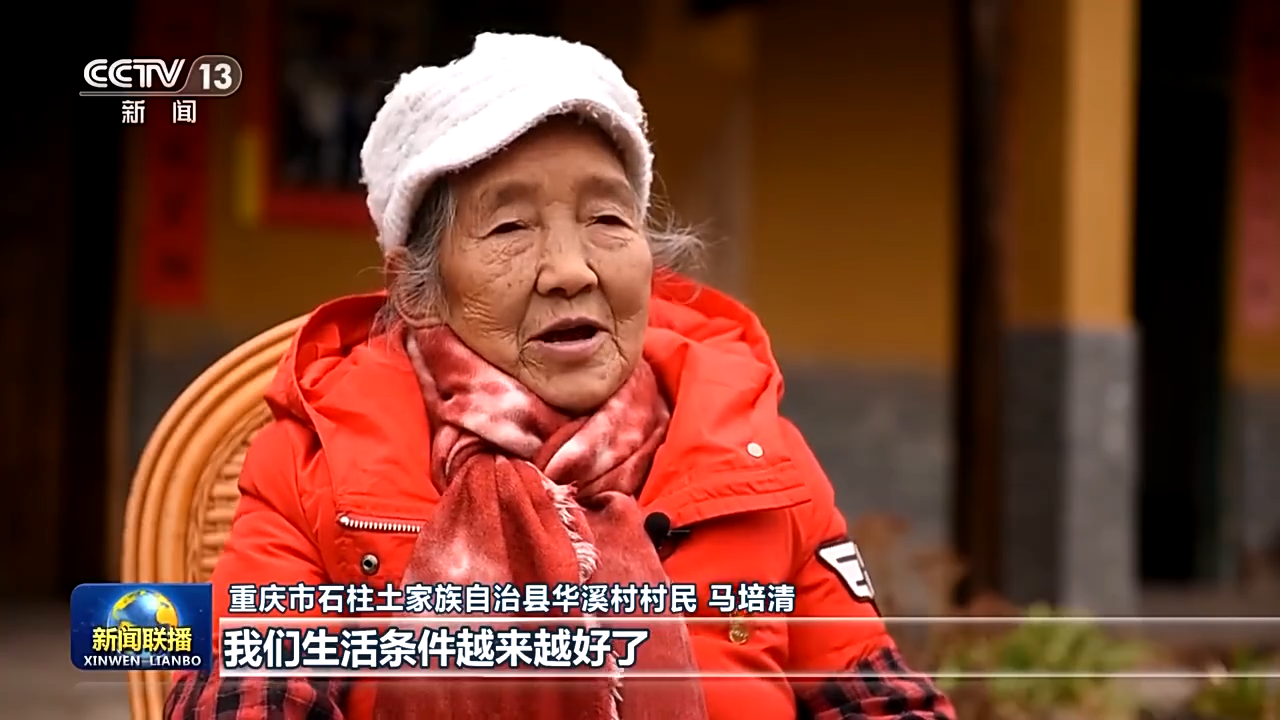 重庆市石柱土家族自治县华溪村村民 马培清:我们生活条件越来越好了,不愁吃、不愁穿。我们住的房子也宽敞了,一家大小吃的自来水干干净净的。现在我们的生活条件发生的变化是习总书记给我们带来的,非常高兴。