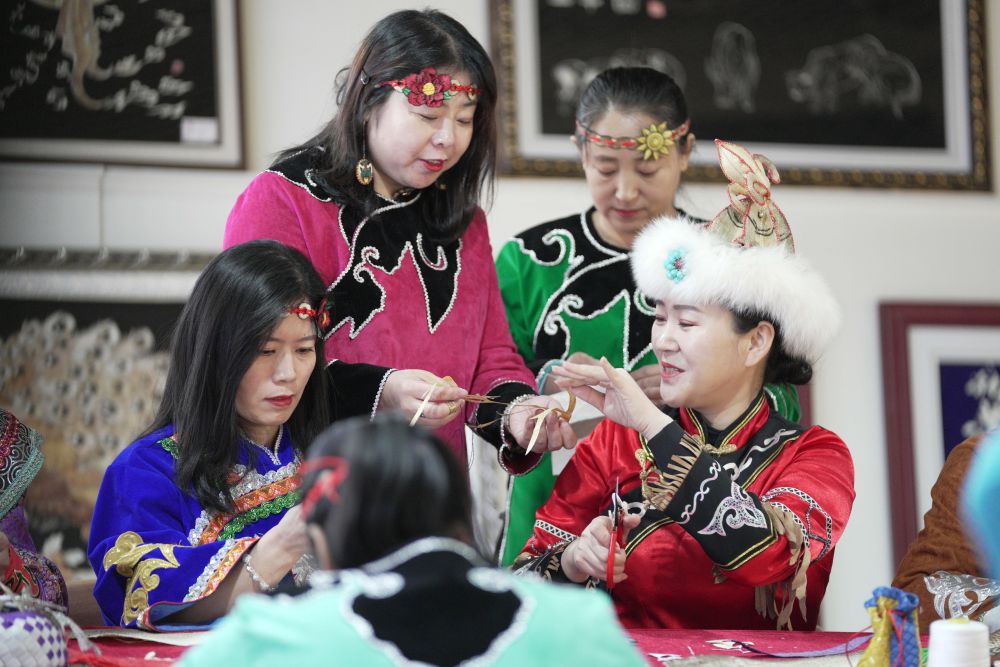2月22日,在黑龙江省同江市非物质文化遗产展示馆,刘蕾(右一)在学习鱼皮制作技艺。新华社记者 王建威 摄