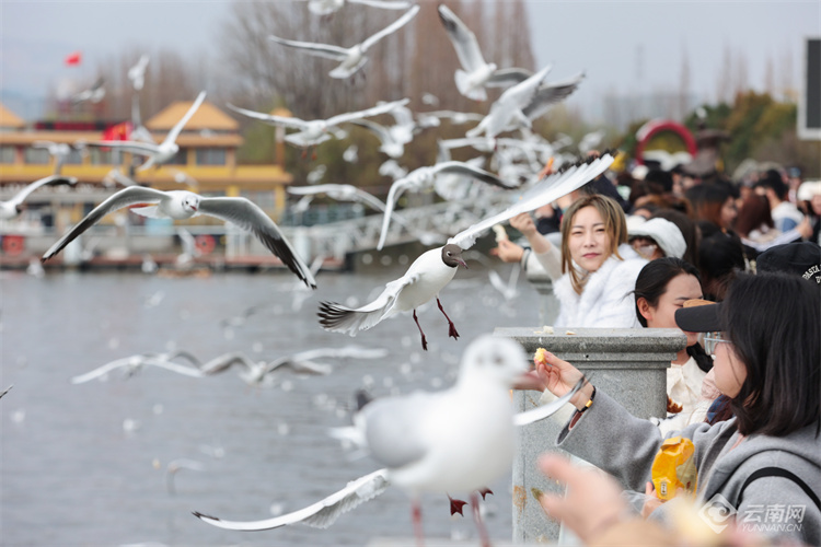 2月26日,昆明海埂大坝红嘴鸥与人同乐。随着天气渐暖,不少红嘴鸥头上的羽毛已由白变灰、变黑,最后披上黑色“头纱”。这也是红嘴鸥逐渐成熟的标志,红嘴鸥换羽后将飞回栖息地繁殖后代。据鸟类专家介绍,预计3月10日后,红嘴鸥将逐渐离开昆明,4月底全部飞离。(云南网 记者陈飞)