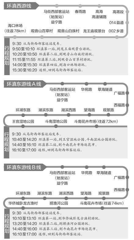 昆明公交环滇观光专线共3条线路,分别为环滇西游线、环滇东游线A线、环滇东游线B线,沿途目的地分别涵盖了观音山白族村、斗南湿地、斗南花卉市场、卧龙古渔村、海口林场等滇池沿岸景点。李正华介绍,目前,昆明公交可提供7座、17座、38座、43座、50座等车型,市民有环滇池观光的出行需求,可以拨打昆明公交服务热线96188预约。