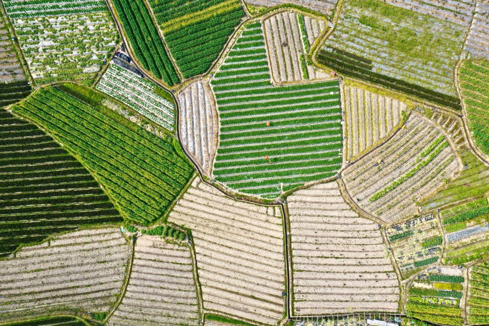 ↑2月26日拍摄的福州市闽侯县南通镇蔬菜基地景观(无人机照片)。
