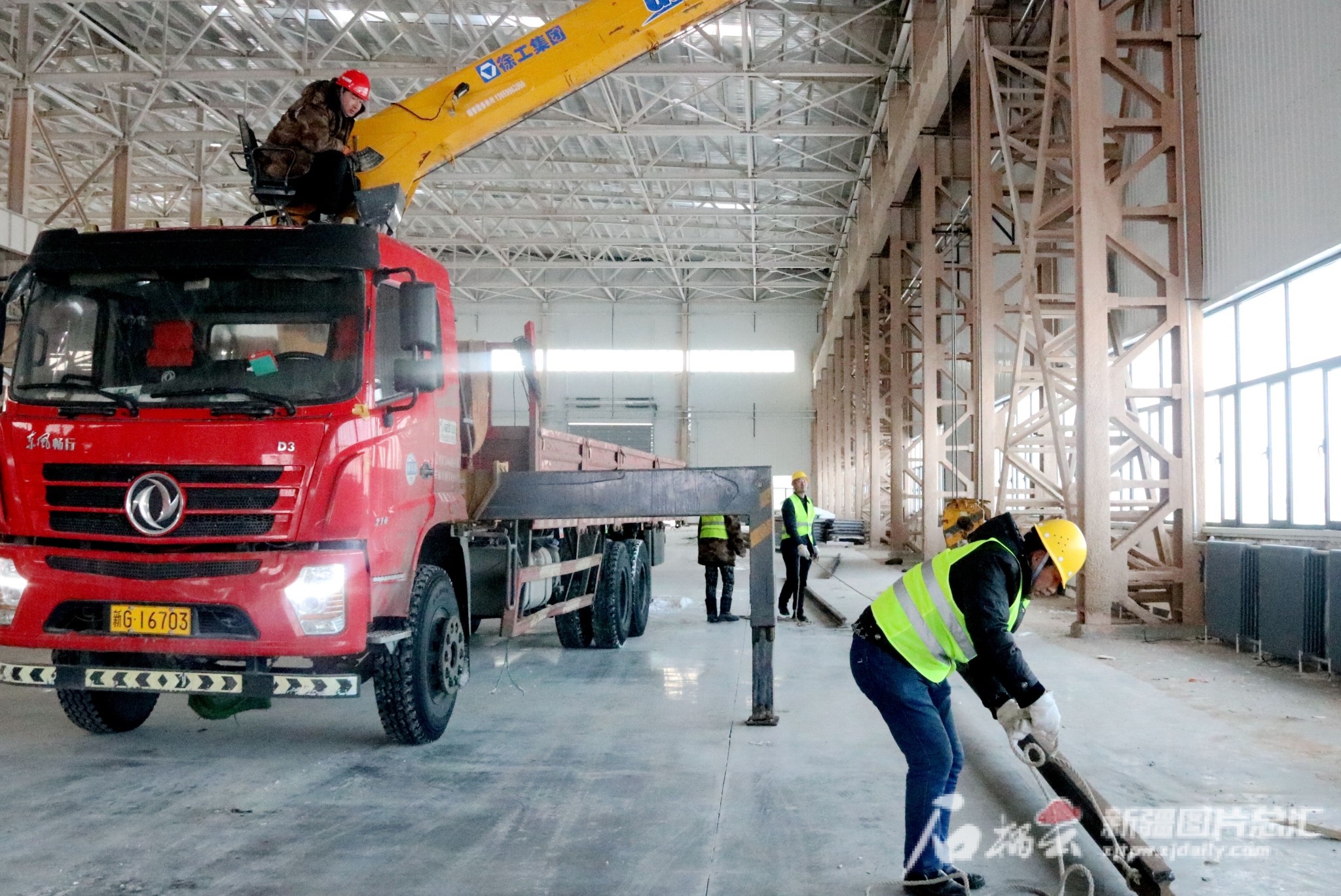 2月14日,工人在三一重能风机制造项目基地吊装行车轨道。王婷摄