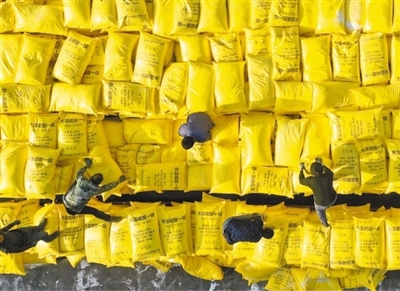 新疆生产建设兵团第一师农业生产资料有限公司的工人在搬运农资。新年伊始,新疆生产建设兵团第一师各农资销售、生产公司加紧筹备农资产品,确保满足春耕春播需求。王志清摄(影像中国)
