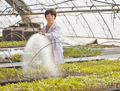 天津市农业科学院创新基地大棚内,研究员金凤媚在进行农作物试验品种的管护工作。新华社记者 孙凡越摄