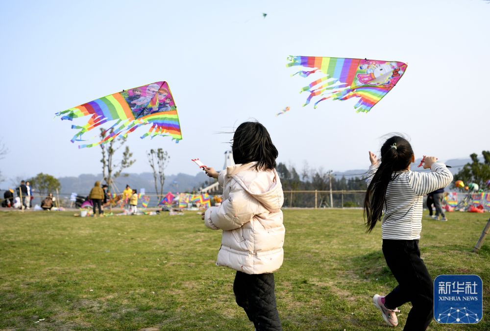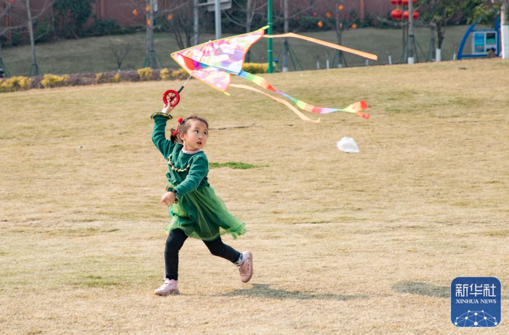 ↑2月26日,小朋友在湖北省宜昌市秭归县茅坪镇望江公园放风筝。新华社发(王辉富摄)