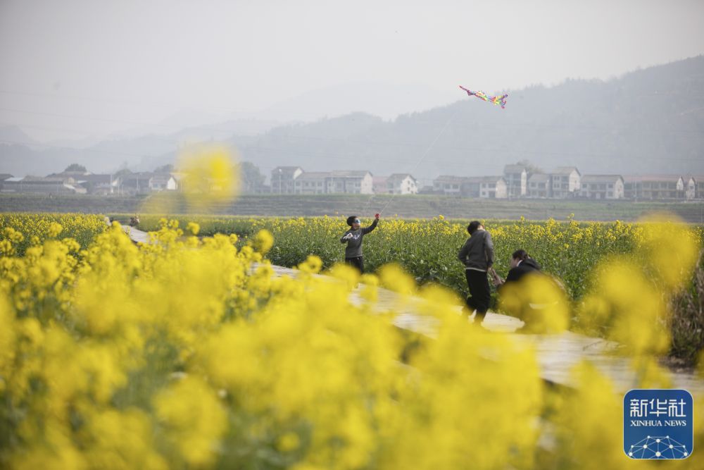 ↑2月26日,在重庆秀山土家族苗族自治县清溪龙凤花海景区,小朋友在油菜花田间放风筝。新华社发(胡程摄)