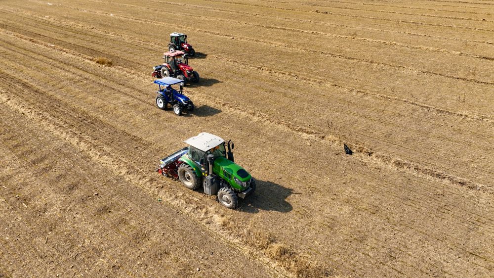 乐陵市来秋农机服务专业合作社的四台新式追肥机正在麦田进行追肥作业。