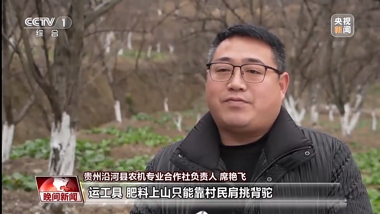 贵州沿河县农机专业合作社负责人 席艳飞:以前在空心李春季管护过程中,运工具、有机肥上山只能靠工人肩挑背驮,耗时耗力不说,还增加人工成本,现在这个山地轨道运输机,给我们帮了大忙,五六百斤的货物放上去,说走就走、说停就停。