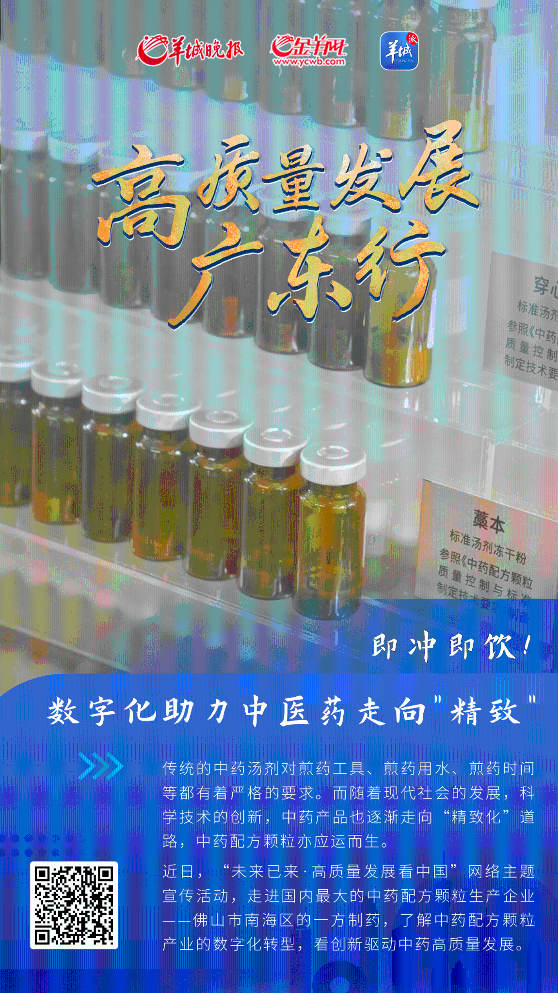 近日,羊城晚报全媒体记者跟随由中央网信办网络传播局指导、广东省委网信办和人民网联合主办的“未来已来·高质量发展看中国”网络主题宣传活动,走进国内最大的中药配方颗粒生产企业——佛山市南海区的一方制药,了解中药配方颗粒产业的数字化转型,看创新驱动中药高质量发展。