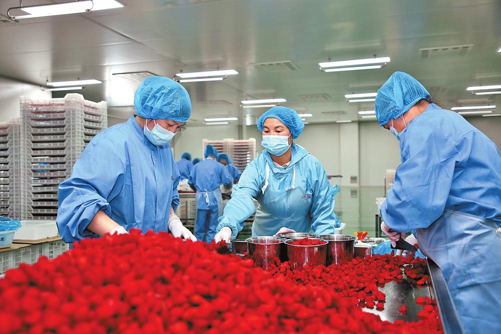 草莓干生产车间里,清洗、浸糖、冷烘、分拣、包装等工序一气呵成。一颗颗红嫩多汁的小草莓摇身一变,成了香甜软糯的草莓干,将销往全国各地。“草莓干的原材料来自待补镇及周边乡镇的草莓种植基地,公司按照市场价收购。”云南沅成农业发展有限公司行政部经理杨清锐介绍。