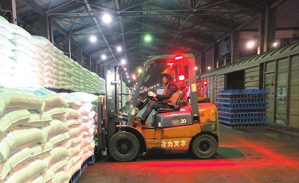 近日,水富市水富火车站云天化专用线一派繁忙,10余台叉车正有条不紊地将2100余吨尿素装运到33节车厢内,这批化肥将发往昆明、玉溪、大理、红河等地。为全力保障春耕物资通道畅通,水富火车站将云天化尿素纳入重点货物运输,开辟专用运输绿色通道,每日对化肥从运输配空、对位、装车、挂运各环节实行全链条管理,24小时动态掌握物资运输需求,随时作出运力调整,确保不误农时。