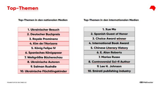 根据全球舆情监测公司融文公司针对 2022年法兰克福书展及展期内话题、人物等报道的数据统计分析,雪漠(Xue Mo)在德国本土之外的国际媒体热点话题排行榜位列第一,关注度超过了书展主宾国西班牙(Spanish Guest of Honor),被认为是2022年法兰克福书展最惊人、最印象深刻的事件之一。雪漠迄今为止出版了105种中文作品,外文版本达59种,被翻译为20多种语言,在海外多地区出版发行。仅美国著名翻译家葛浩文、林丽君夫妇就翻译了雪漠的《大漠祭》《猎原》《白虎关》《野狐岭》《西夏咒》《深夜的蚕豆声》《羌村》《爱不落下》《沙漠的女儿》和史诗《娑萨朗》等10多部作品。