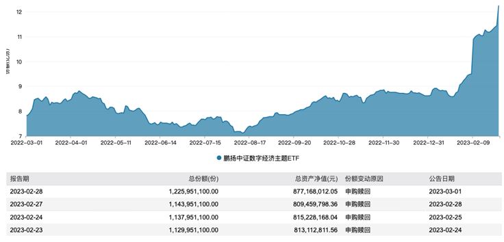 数据显示,截至2月28日,鹏扬中证数字经济主题ETF基金规模为8.77亿元。在2023年之前,鹏扬中证数字经济主题ETF总份额曲线波动较小,且个人投资者占主导,机构持有比例仅不到7%,不过从今年2月初开始,该ETF基金总份额一路飙升,一个月大幅增加了近3亿份,目前基金总份额超过12.25亿份,创出历史新高。