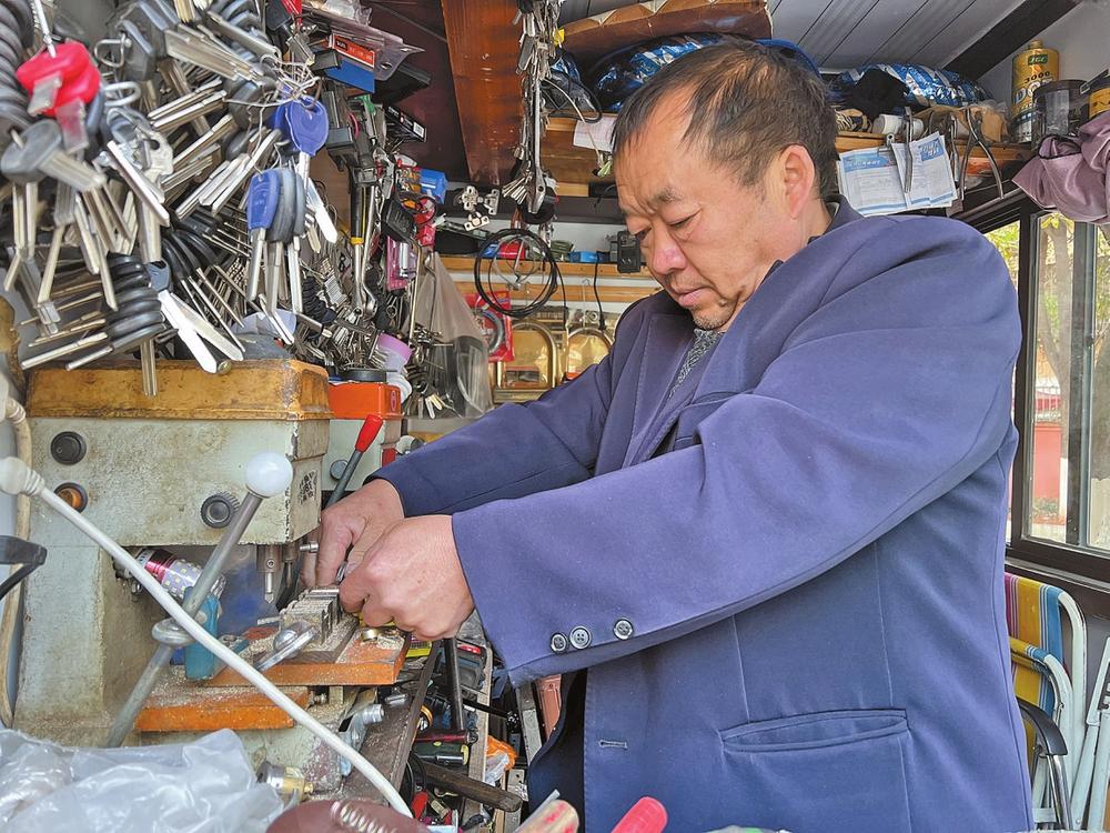 在新闻里社区门口,秦师傅的便民服务摊已经经营了20多年,成了不少市民换拉链、剪裤腿、改衣服、配钥匙的首选去处。
