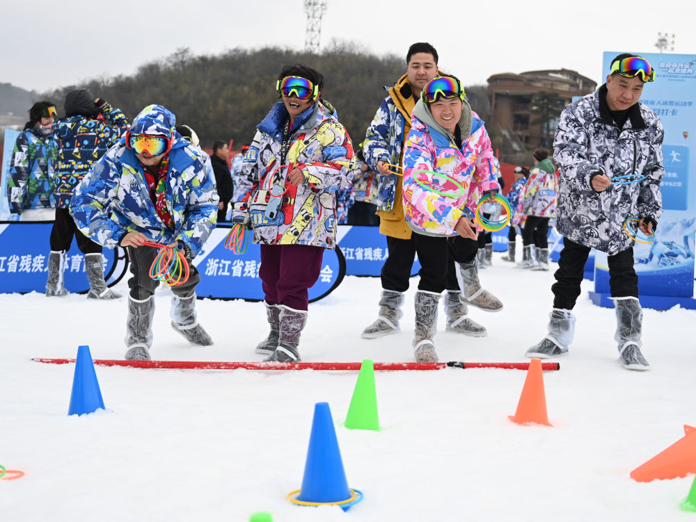 2月23日,残疾人代表在浙江省湖州市安吉县山川乡云上草原滑雪场体验雪地套圈项目。新华社记者 黄宗治 摄