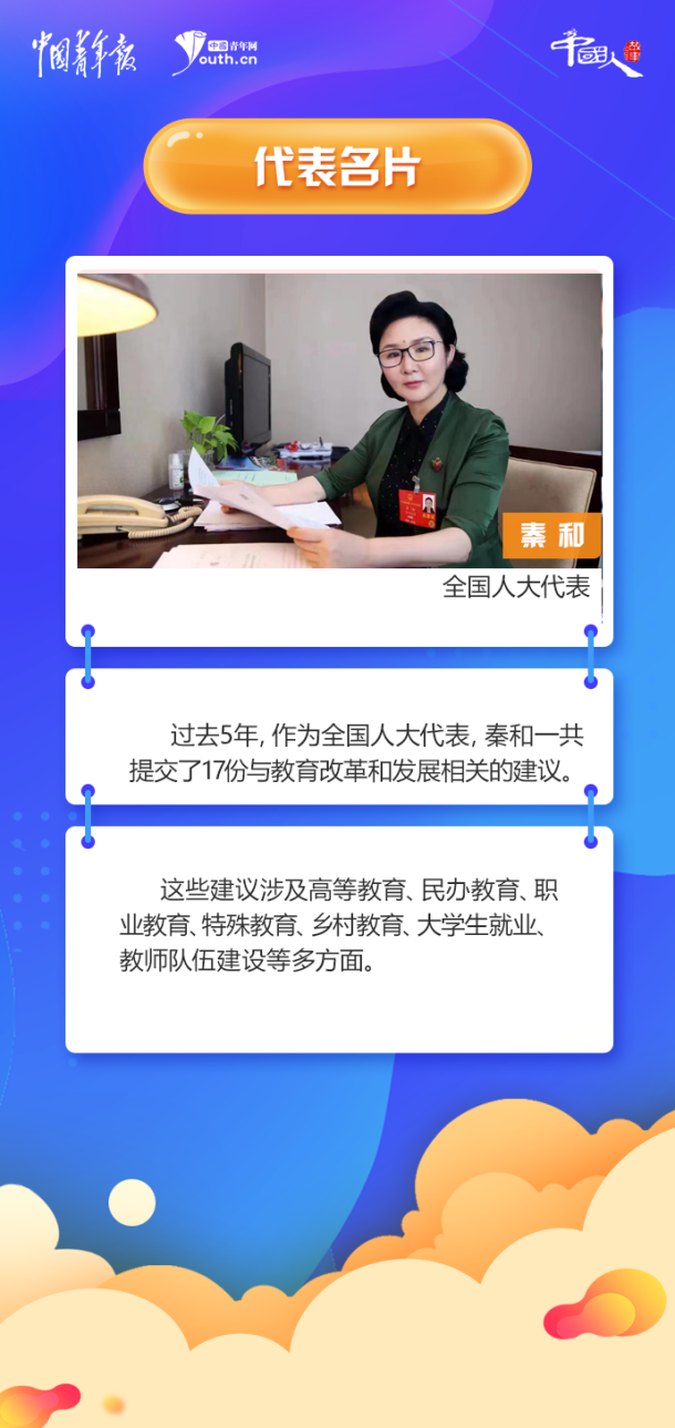 过去5年,作为全国人大代表,秦和一共提交了17份与教育改革和发展相关的建议,涉及高等教育、民办教育、职业教育、特殊教育、乡村教育、大学生就业、教师队伍建设等多方面。