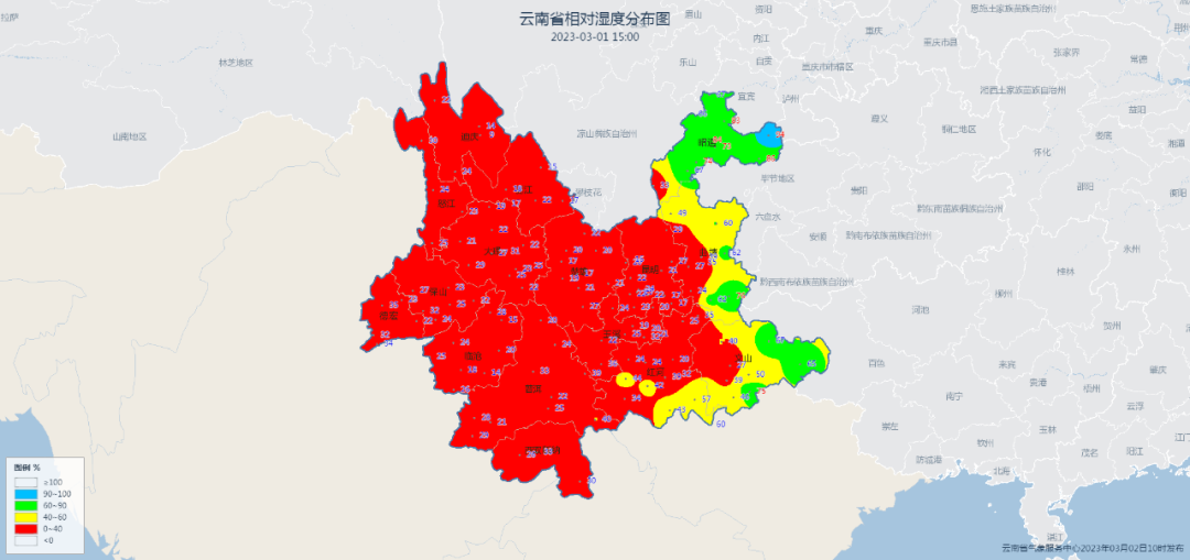 从3月1日下午15时云南省相对湿度图上看到,除了滇东、滇东南边缘外,大部地区空气相对湿度不足30%,天气显得非常干燥。