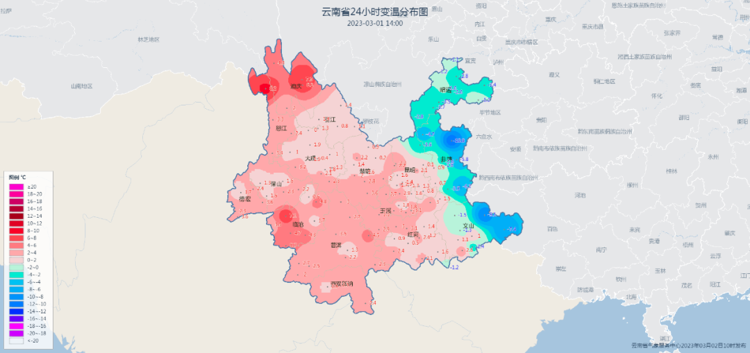 3月1日在冷空气影响之下,昭通南部、曲靖东部、文山东部日最高气温下降了 6~8℃,局部 10~12℃;降温的同时,昭通、曲靖东部、文山、红河东南部还伴有小雨局部中雨落下,其中镇雄甚至出现了雨夹雪天气。