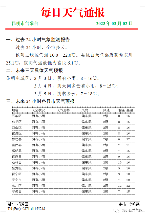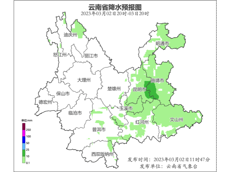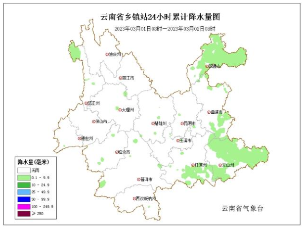 03月02日20时到03月03日20时:昭通、曲靖、文山、昆明、玉溪、红河、普洱东部、西双版纳东部阴天间多云有零星小雨局部中雨,迪庆西部、怒江西部多云局部有阵雨,其它地区多云。