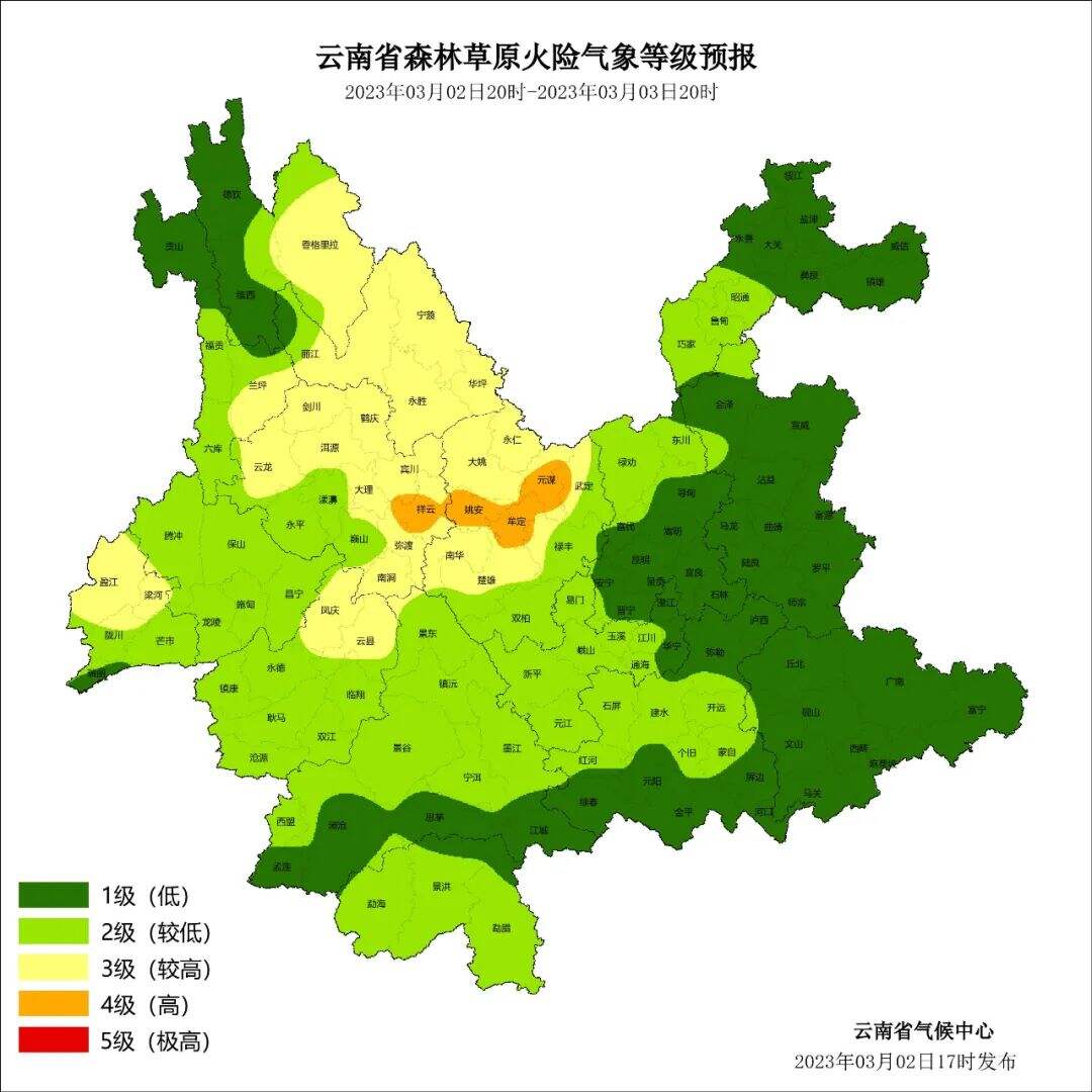 森林火险:预计未来24小时大理东部边缘、楚雄中部4级,迪庆东部、怒江东部、丽江、德宏北部、大理、临沧北部、楚雄北部3级,其它地区1~2级。