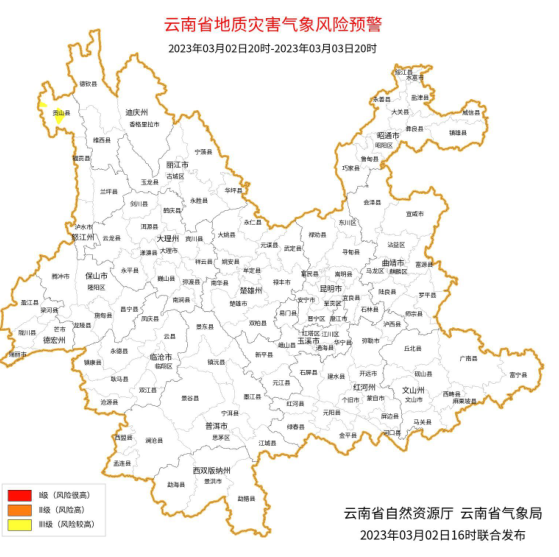 地质灾害方面,3月02日20时至3月03日20时,怒江州西北部发生滑坡、泥石流的风险较高。