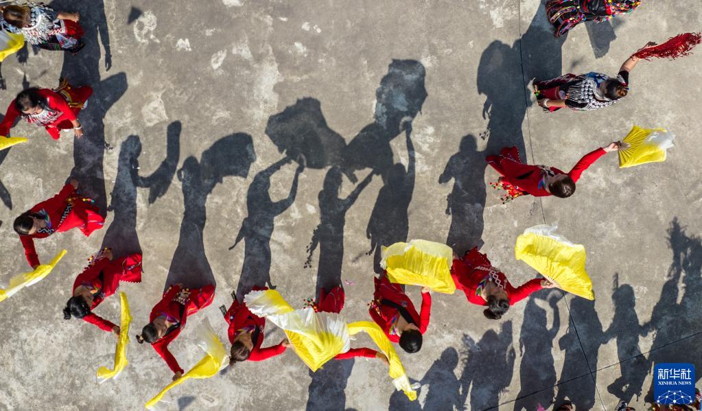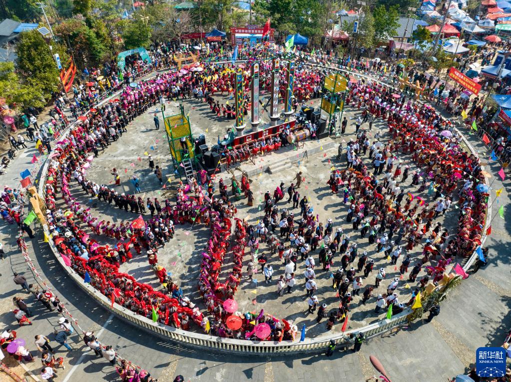 3月2日,当地群众与来自各地的游客踩着相同的鼓点进场舞蹈(无人机照片)。新华社记者 江文耀 摄