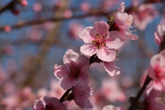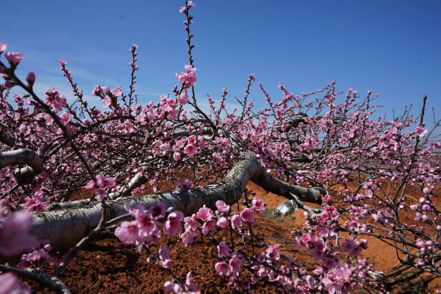 仲春时节,正值桃花盛开,在陆良县青山和大莫古镇麻舍所等地的桃园里,桃花竞相绽放,一簇簇粉红的桃花挂在枝头,粉红娇艳,微风拂过,一朵朵盛开的桃花随风摇曳,花香迎面扑来,蜜蜂在花间采蜜,春日美景美不胜收。
