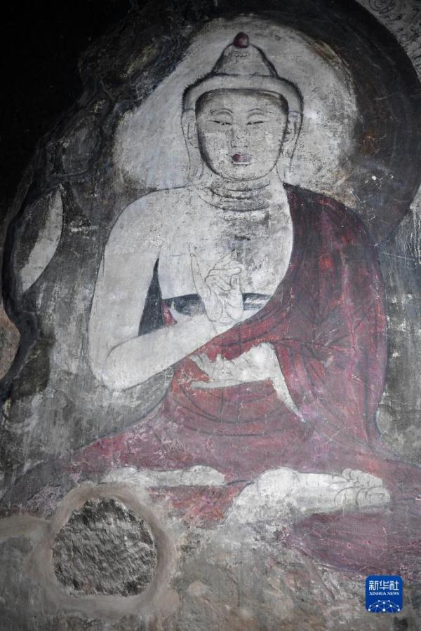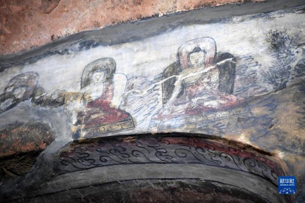 这是宁夏须弥山石窟圆光寺48号窟内完成修复的壁画(2月28日摄)。新华社记者 王鹏 摄