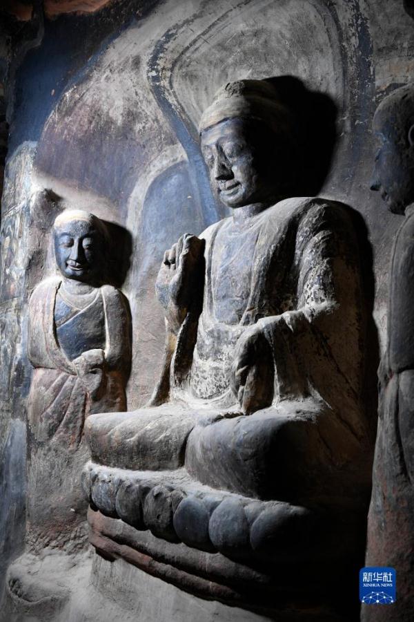 这是宁夏须弥山石窟圆光寺48号窟内完成修复的佛像(2月28日摄)。新华社记者 王鹏 摄