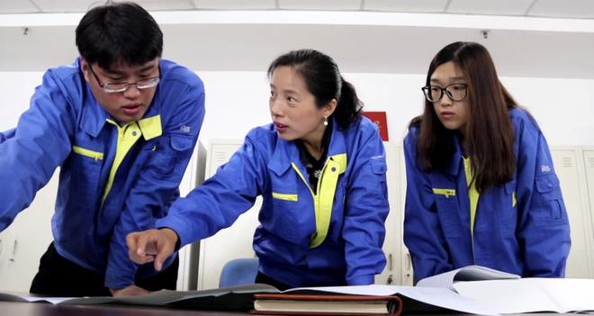 姜妍(中)在与同事进行工作交流。沈鼓集团党委宣传部供图