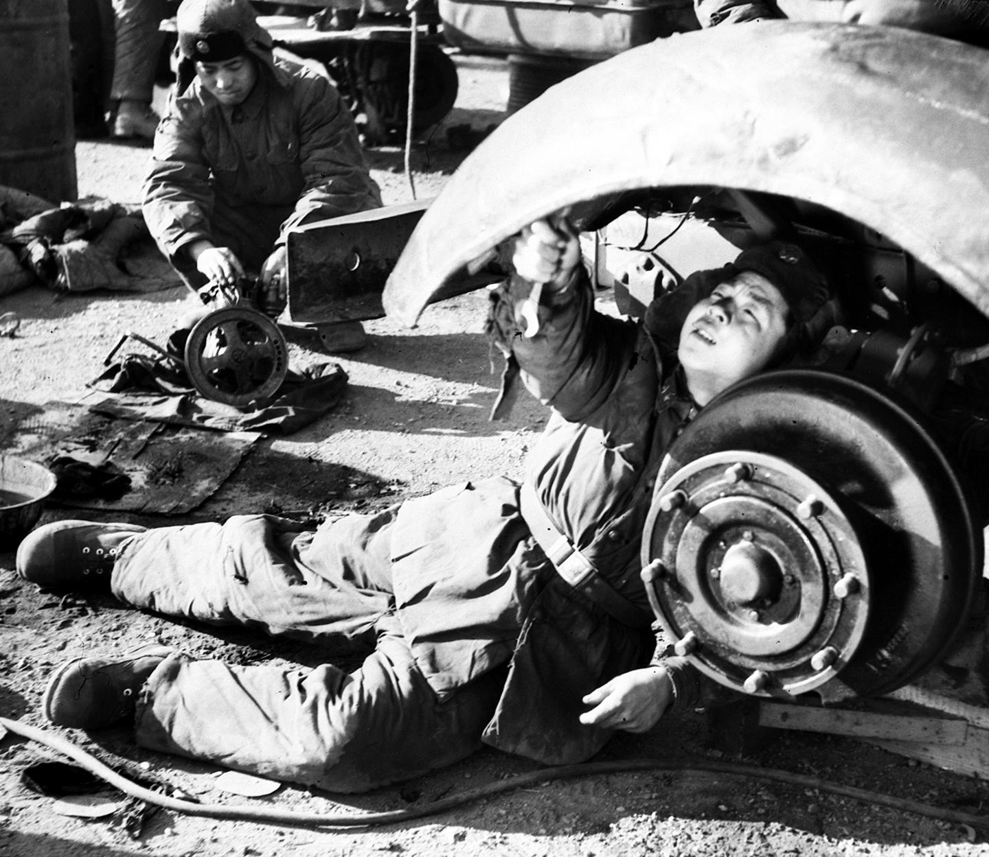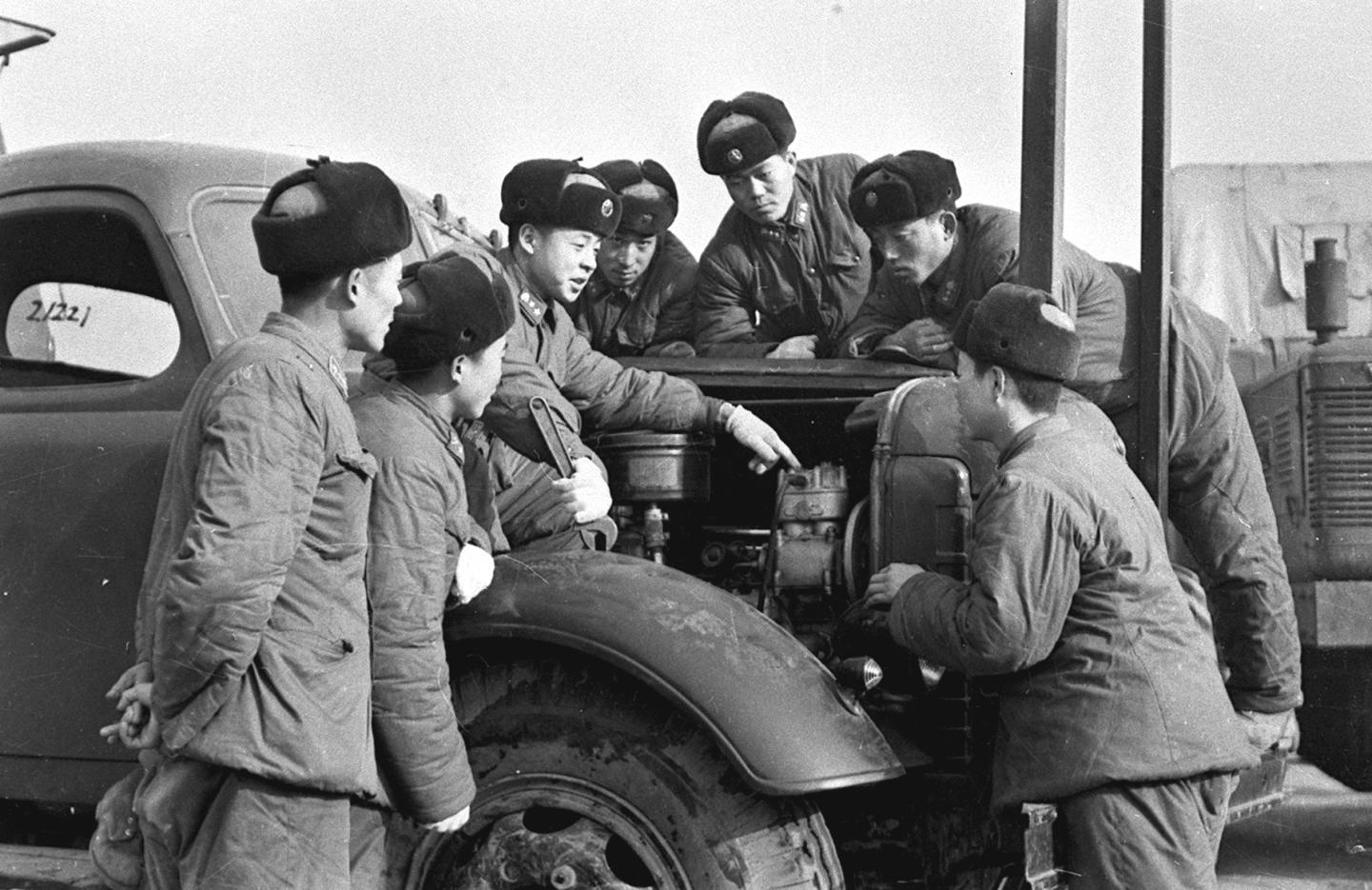 ↑雷锋(左三)在向战友们传授安全行车和节油的经验。