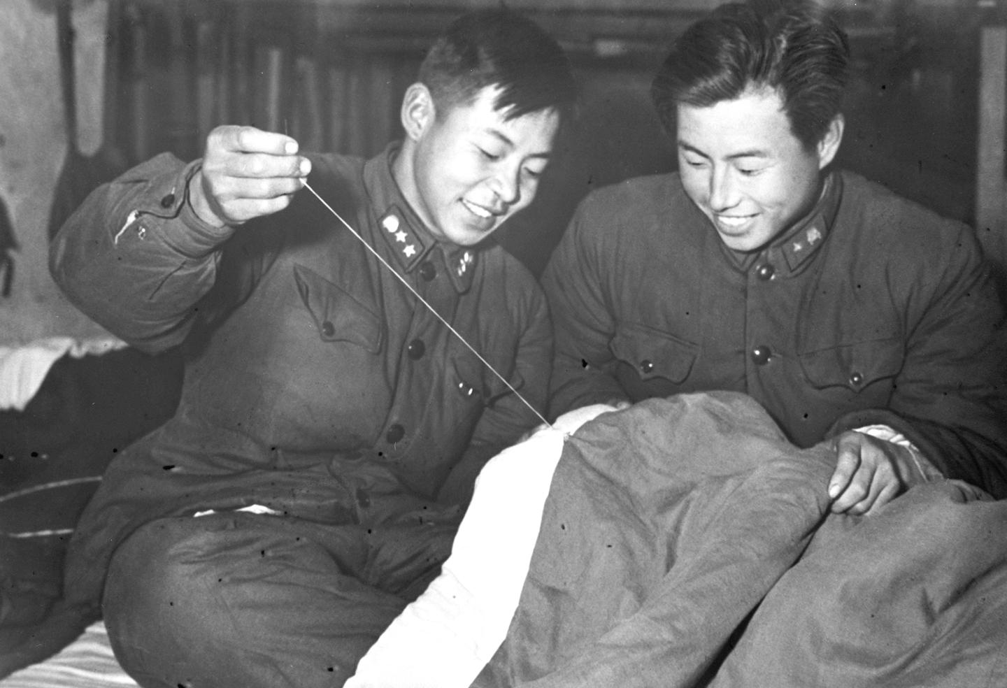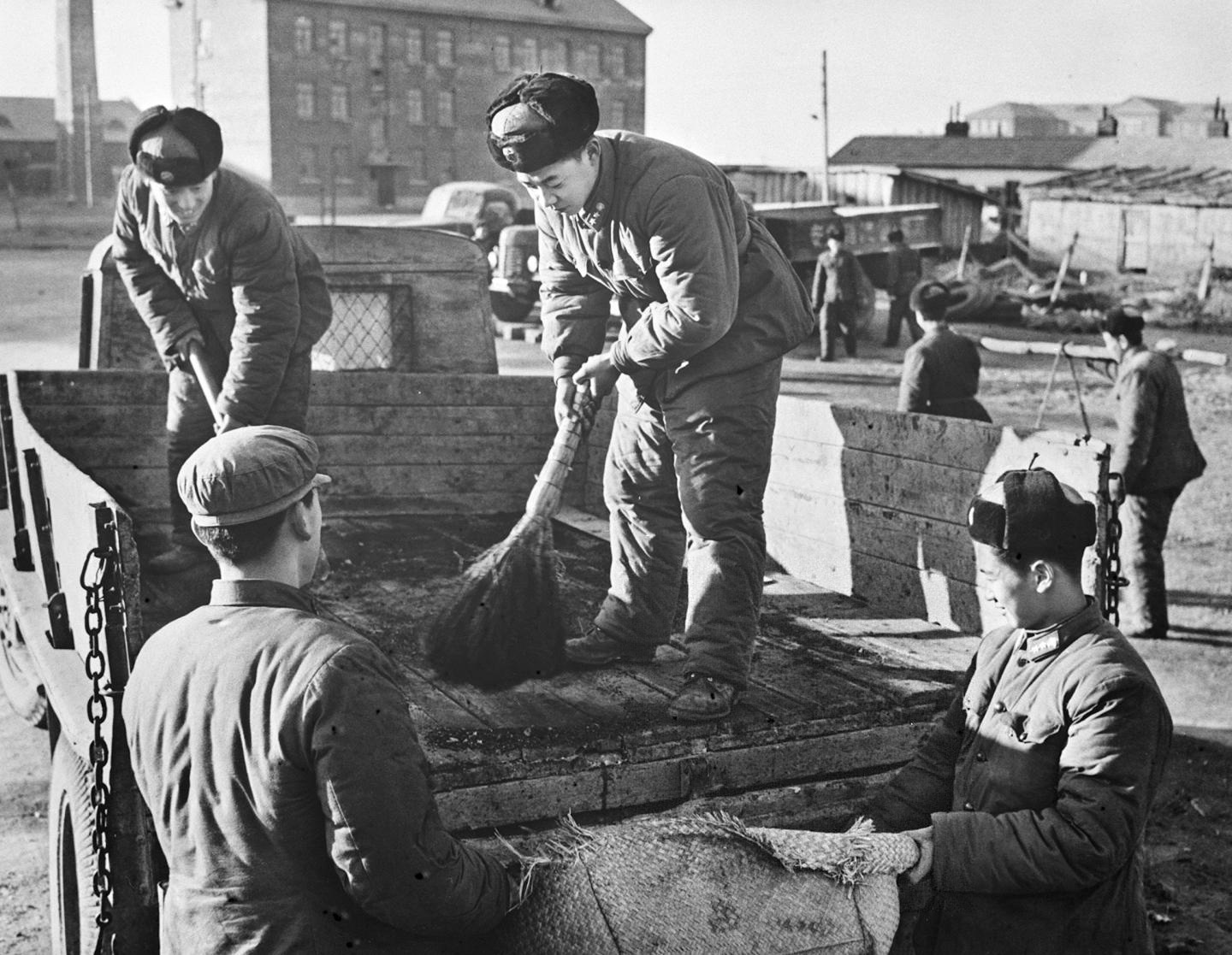 ↑1959年2月,雷锋所在鞍钢洗煤车间吊车组被评为红旗组,这是雷锋(后排右二)和工友合影。