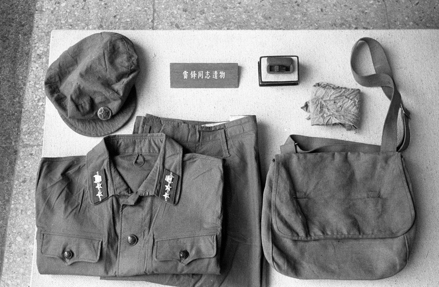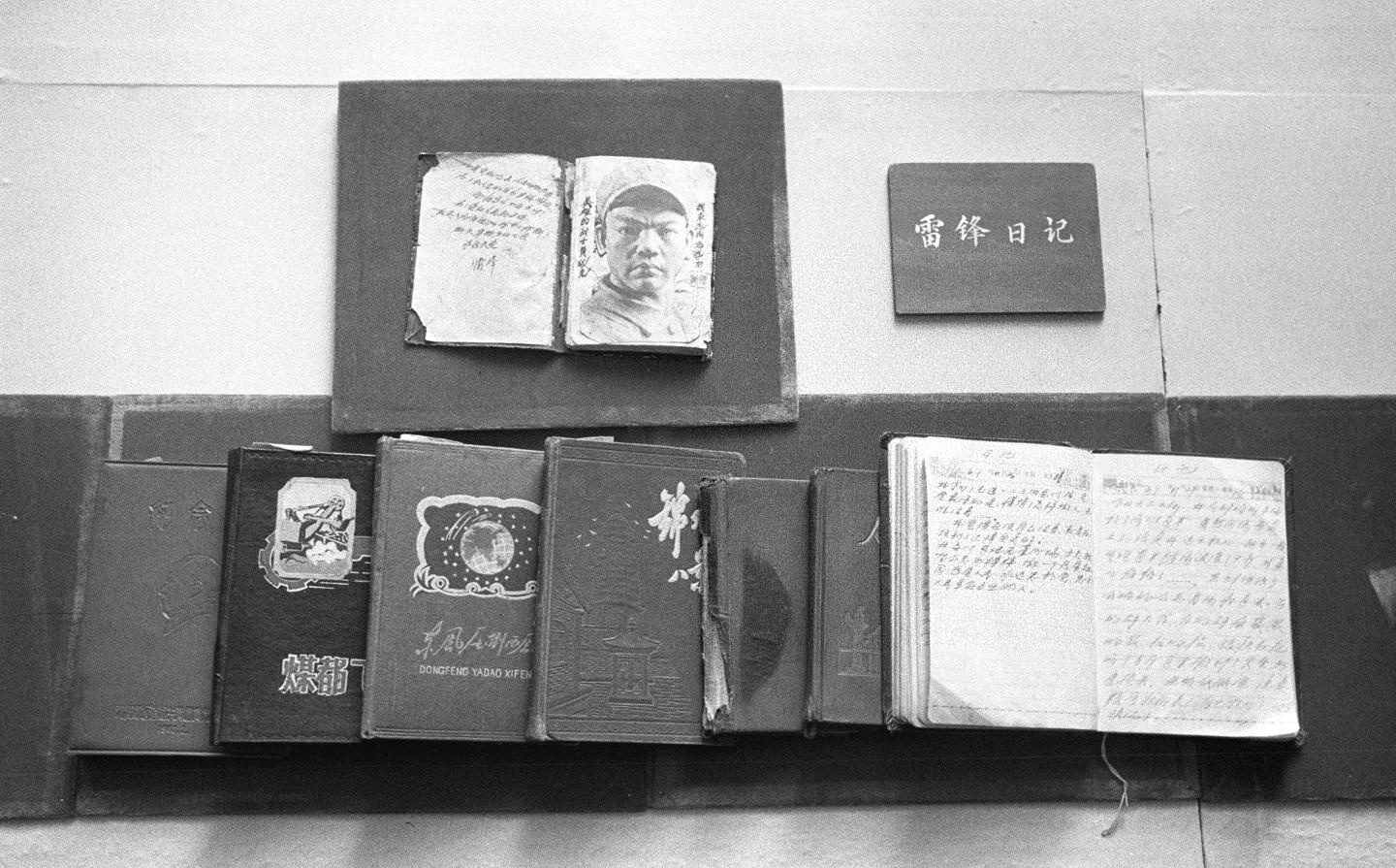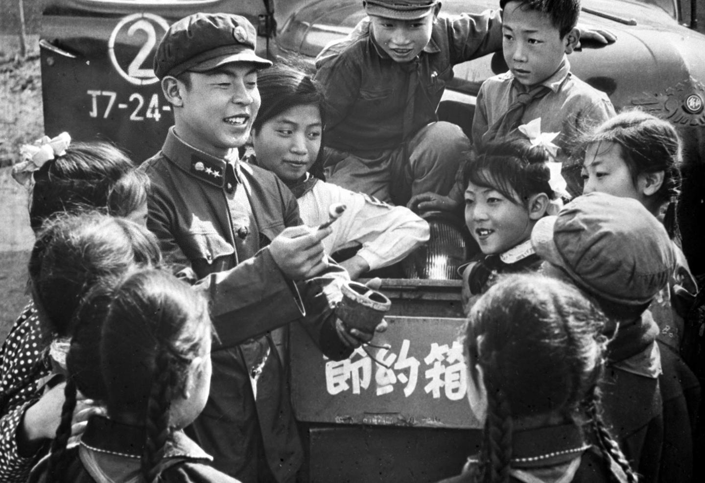 ↑雷锋被聘为某小学的校外辅导员,他教育孩子们不要忘记艰苦奋斗的光荣传统。