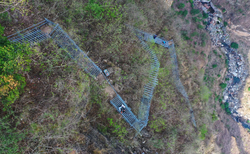 在四川省凉山彝族自治州昭觉县“悬崖村”阿土列尔村,村民沿着钢梯下山(2020年5月13日摄,无人机照片)。新华社记者 王曦 摄