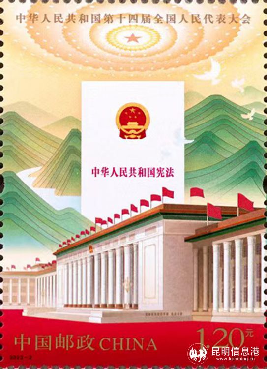 据了解,《中华人民共和国第十四届全国人民代表大会》纪念邮票一套1枚,邮票图案名称为中华人民共和国第十四届全国人民代表大会。全套邮票面值1.20元。邮票计划发行数量为880万套。邮票画面以北京人民大会堂以及《中华人民共和国宪法》封面为主体形象,画面背景表现了锦绣山河,象征广大人民群众,寓意在党的领导下我国的人民代表大会制度不断巩固和发展,整体画面简洁、庄重、大气,体现出宪法的崇高地位。