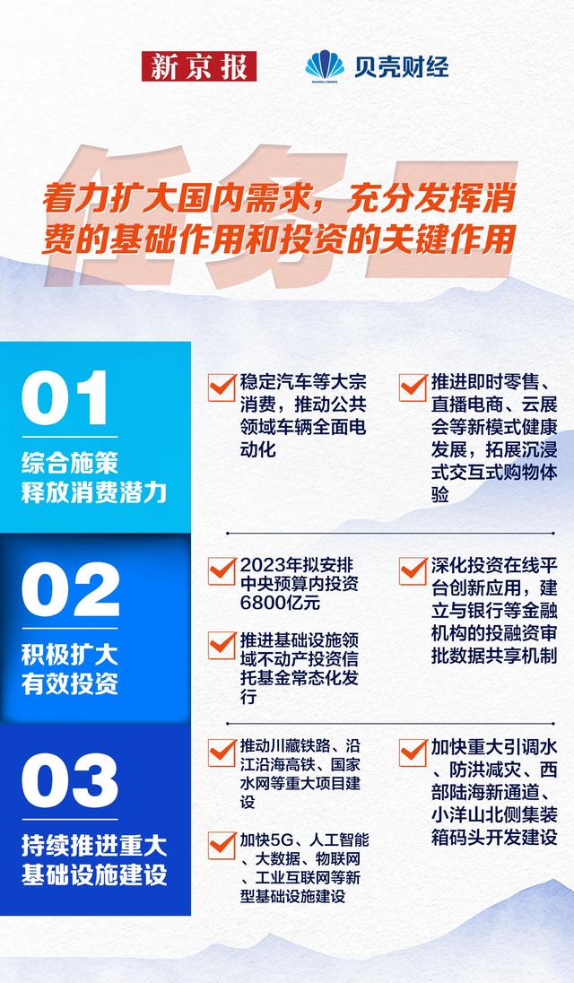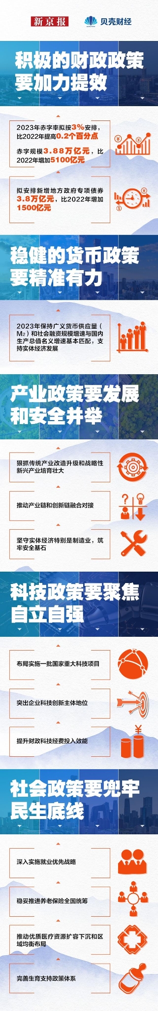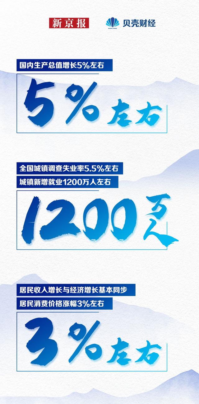 2023年3月5日,第十四届全国人民代表大会第一次会议上政府工作报告提出,今年发展主要预期目标是:国内生产总值增长5%左右;城镇新增就业1200万人左右,城镇调查失业率5.5%左右;居民消费价格涨幅3%左右;居民收入增长与经济增长基本同步。新京报贝壳财经制作《十大任务读懂2023中国经济发展怎么干?》,为你解读今年经济发展密码。