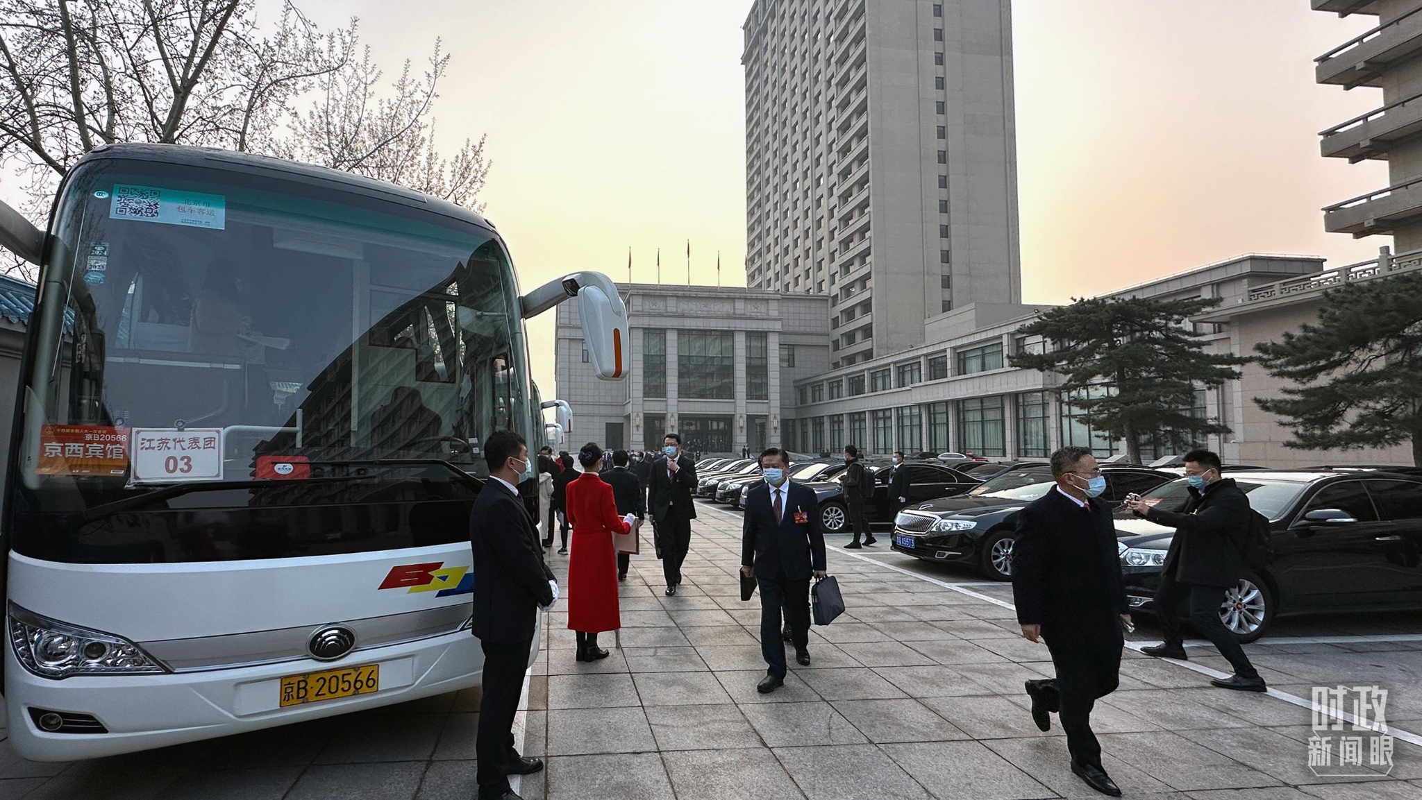 2023年3月5日,江苏代表团乘车前往人民大会堂。(江苏省广播电视总台记者 周明、张正拍摄)