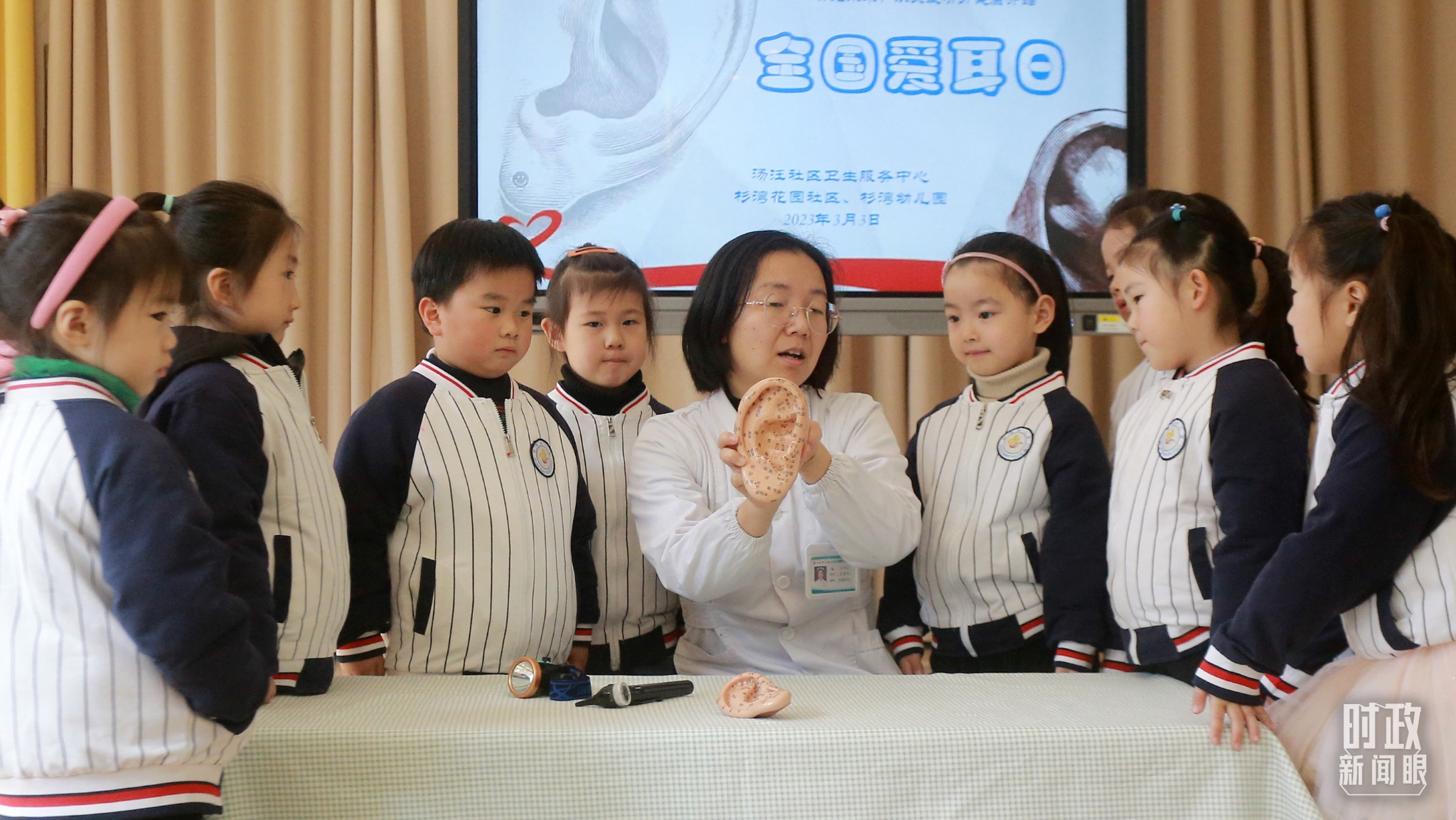 2023年3月3日,全国爱耳日当天,江苏扬州一位社区医生正在为小朋友们讲解护耳知识。(图/视觉中国)