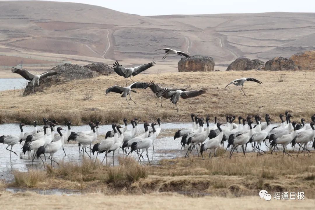 黑颈鹤,属国家一级保护动物,昭通市大山包黑颈鹤国家级自然保护区,是目前中国已知的越冬黑颈鹤种群数量最多、密度最大的栖息地之一。初春的昭通大山包,虽未到山花烂漫的时节,但近1900只高原精灵黑颈鹤翔集于此,为平凡的春色增添了许多生机。
