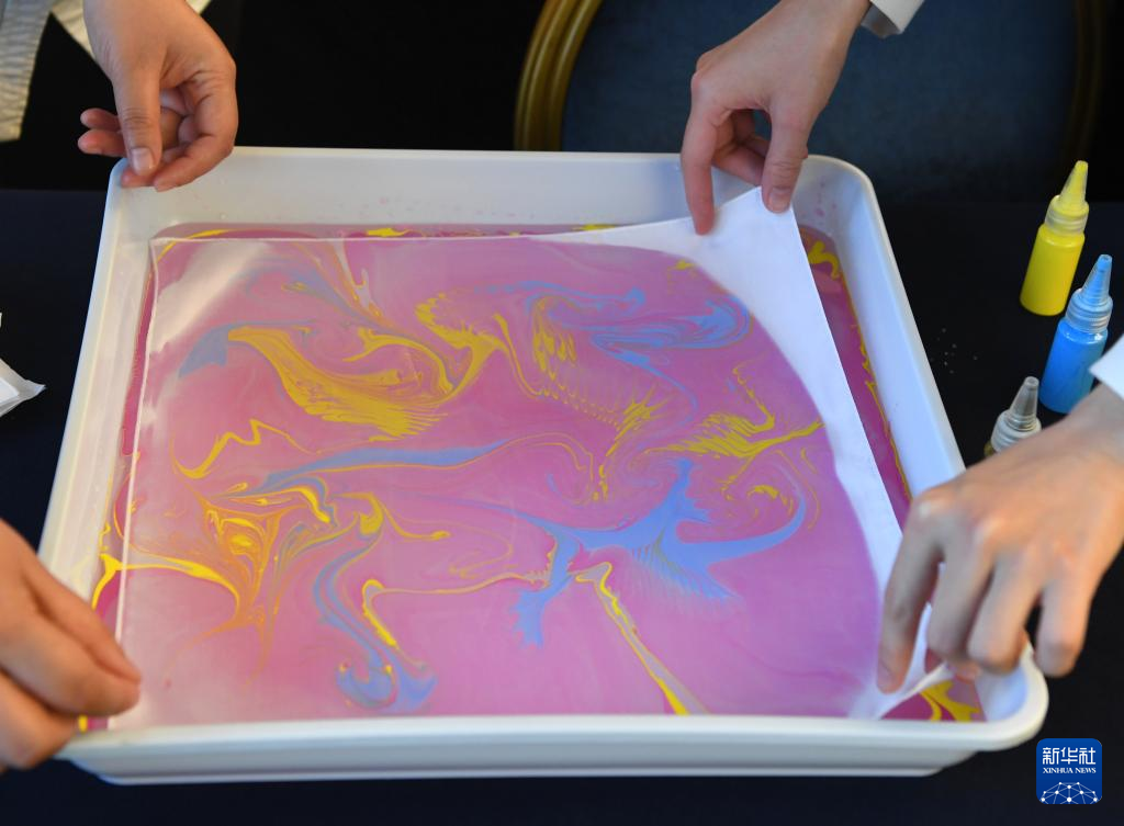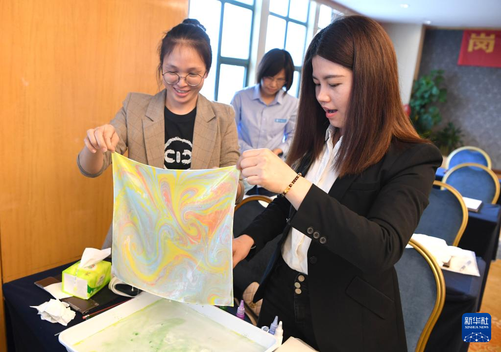 3月4日,中建三局一公司广西分公司在广西南宁市举办“三八”国际妇女节主题活动,数十名奋战在建筑工程一线的女员工在老师的带领下学习水拓画技艺,以独特方式迎接自己的节日。新华社记者 周华 摄