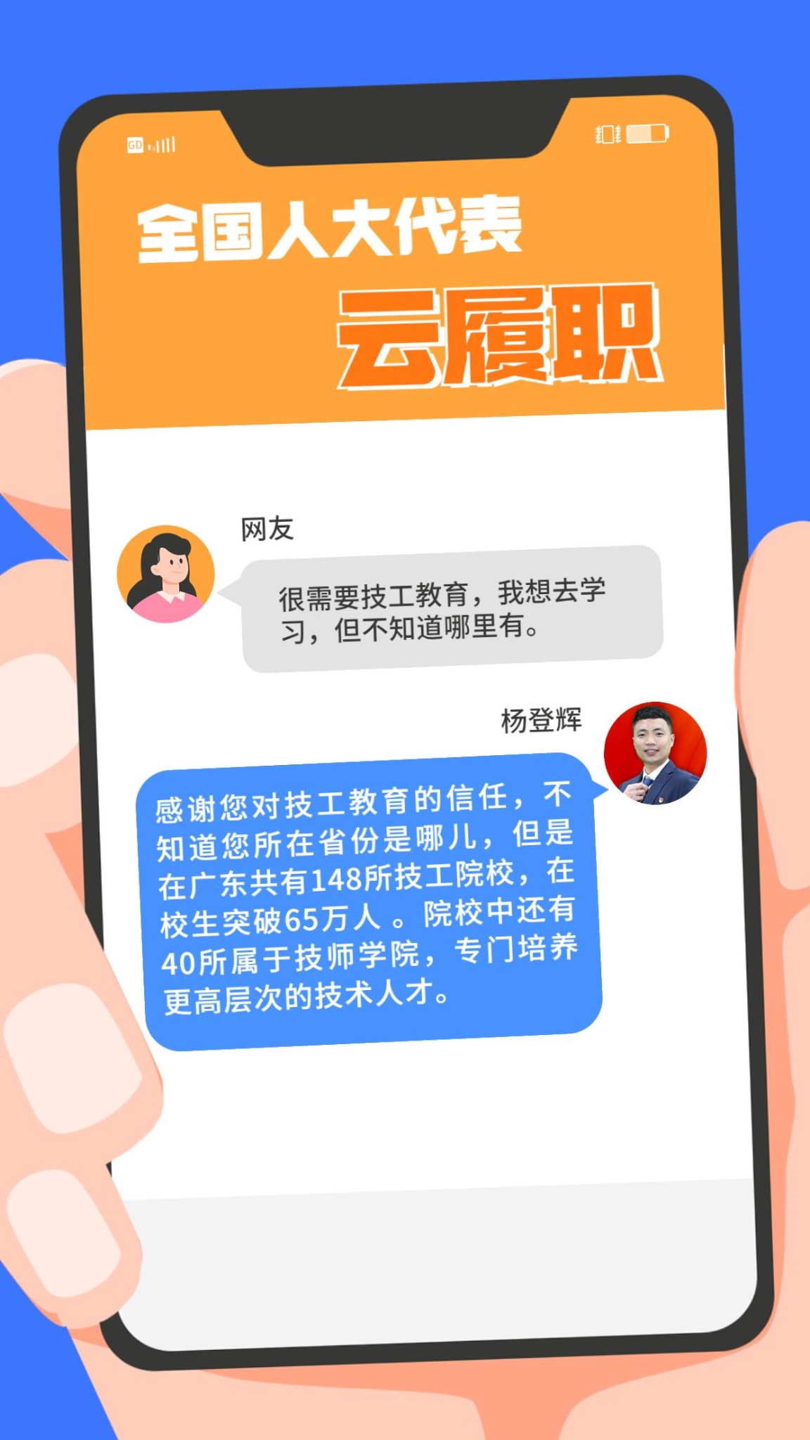 现实中,“技能人才短缺”现象频频出现。针对技能人才的供给与产业发展的实际需求在规模、结构和质量上不对称、不适应等问题,全国人大代表、第44届世界技能大赛冠军杨登辉在赴京履职前,通过线上方式征求网友的意见。对部分有代表性的留言,杨登辉一一作了回复。来看看这位95后全国人大代表怎么说↓↓↓